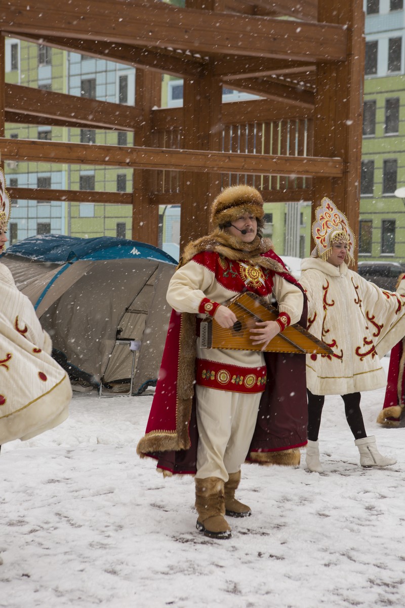 Русский народный ансамбль выступает на открытом воздухе в зимних костюмах на масленичных гуляниях